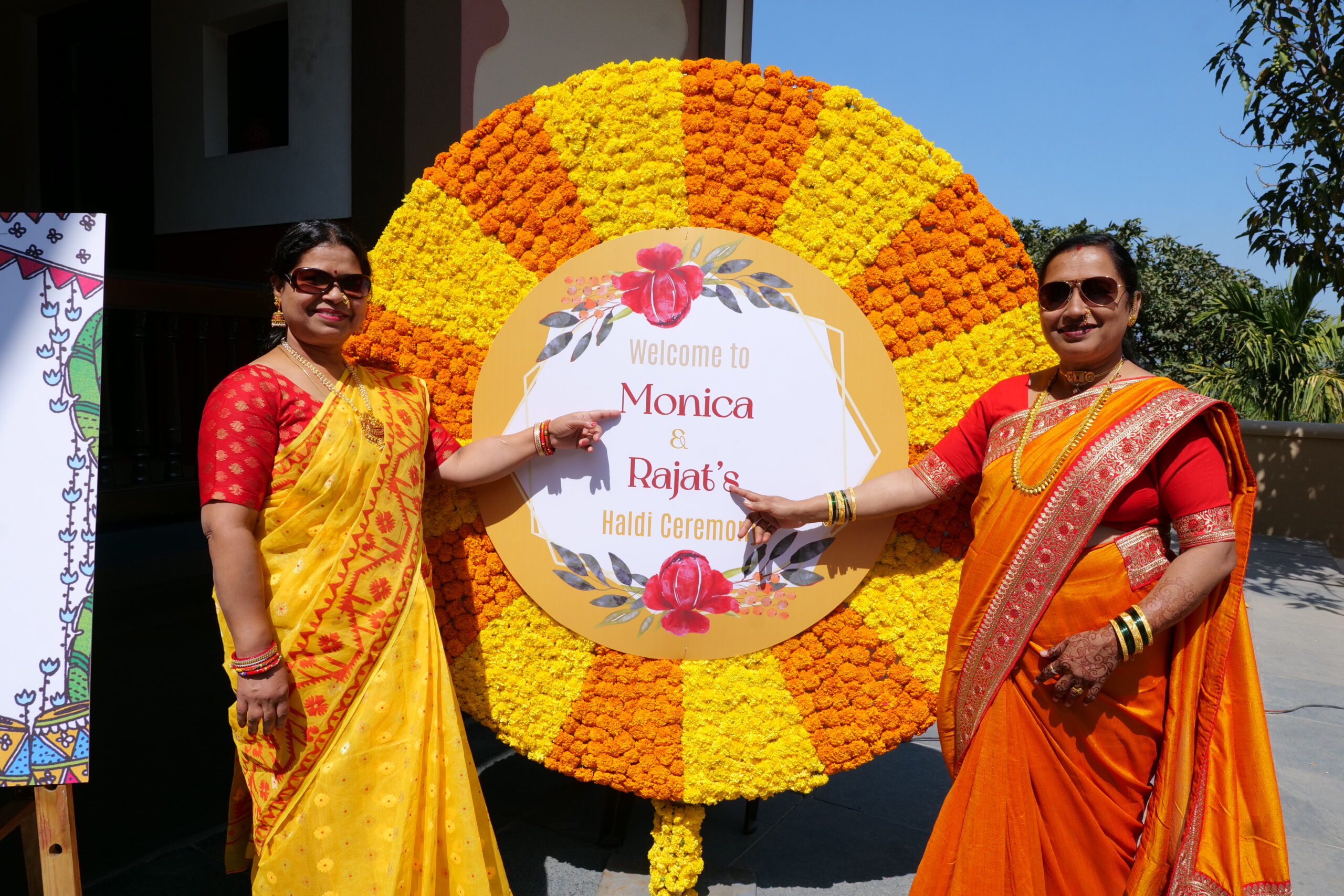Simple and elegant sets adorned and beautifed the venue for the mehendi/haldi and sangeet events. The wedding set had a charismatic charm of it’s own. Detailed flower work of marigolds and greens adorned the wedding mandap which spread a holistic vibe around the ambience. Monica and Rajat duly followed the traditional wedding rituals from jaimala to saptapadi as everyone celebrated the union of this newly married couple. Following are the snippets from Monica and Rajat’s Lonavala destination wedding: