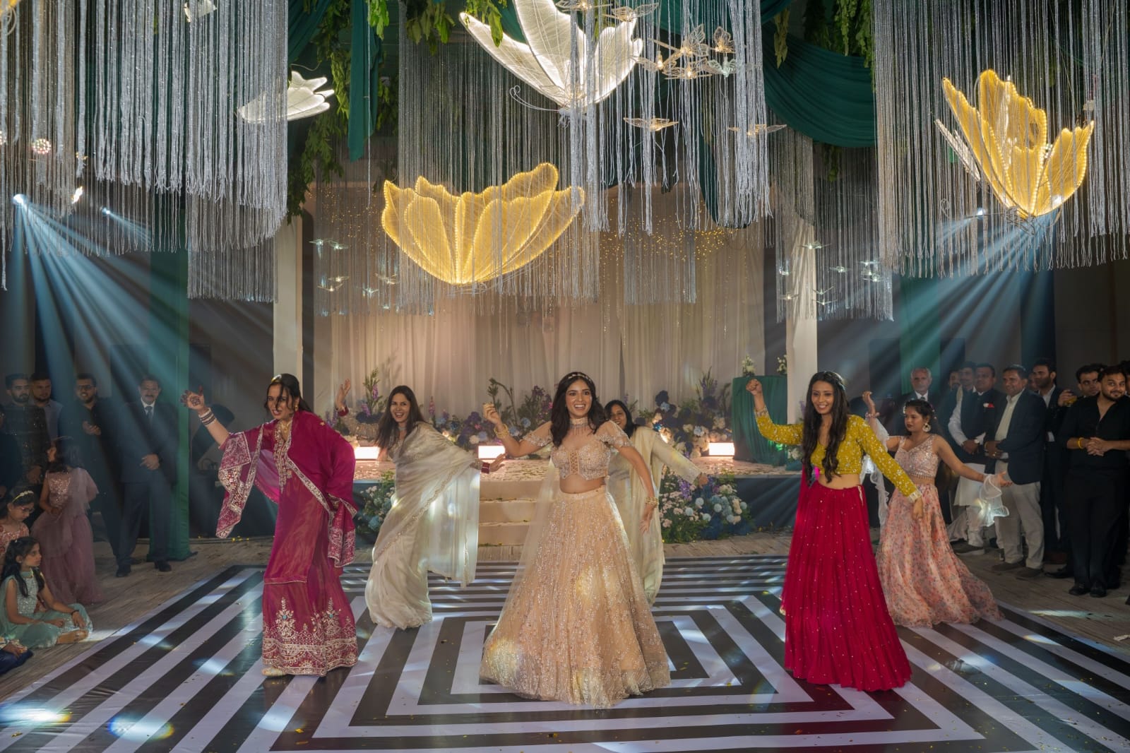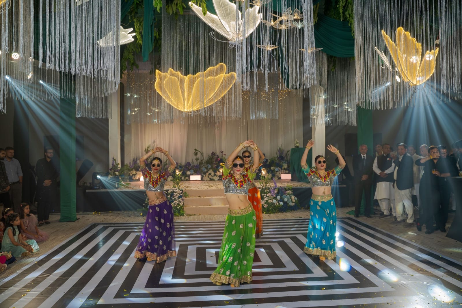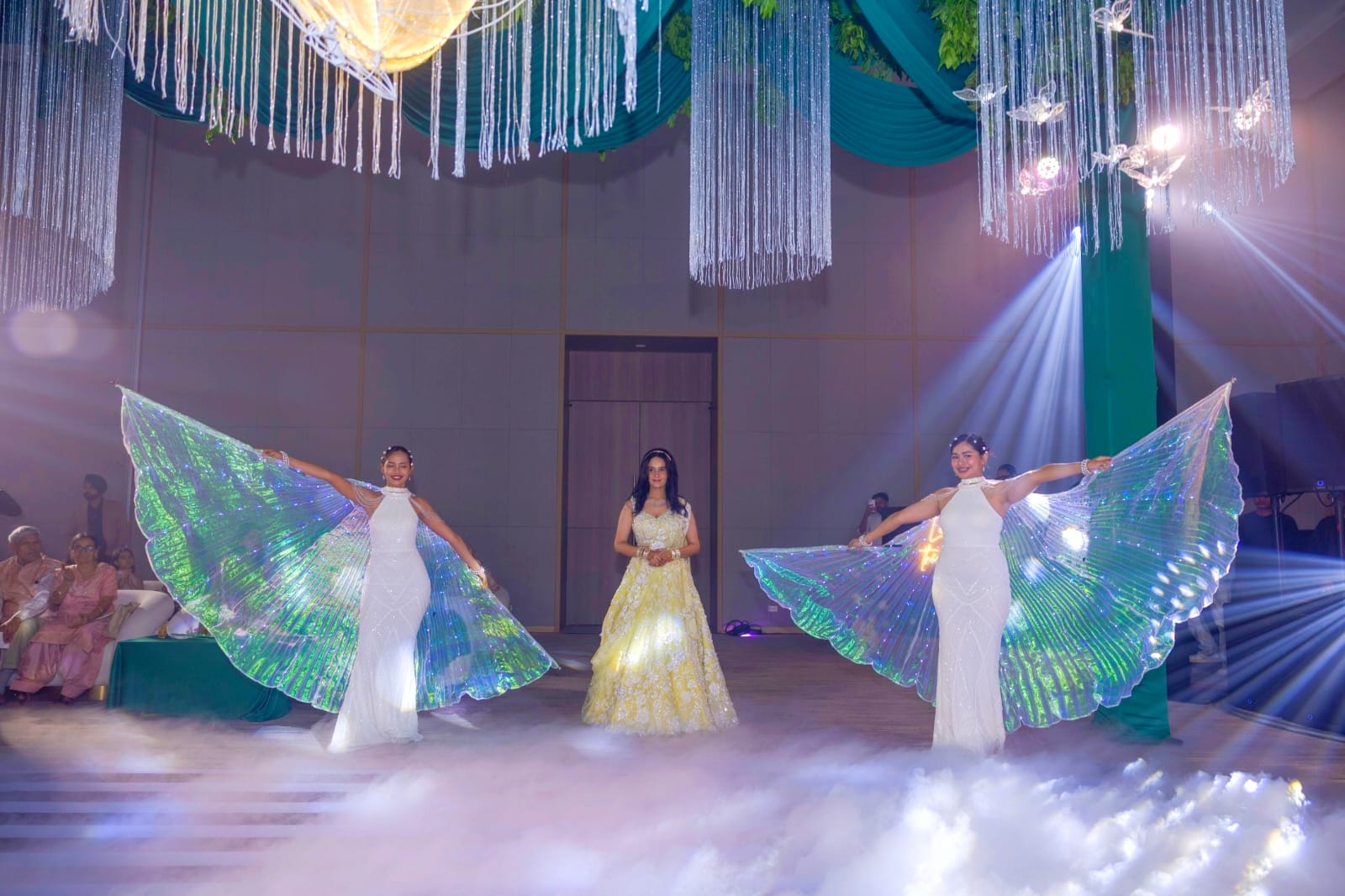 Taking Emerald green and silver color as a base, a grand decor was set up at the ballroom for the sangeet event. Led wing girls accommpanied the bride as she made a dazzling entry. Thai dancer troupe entertained the guests with their performances on bollywood numbers.