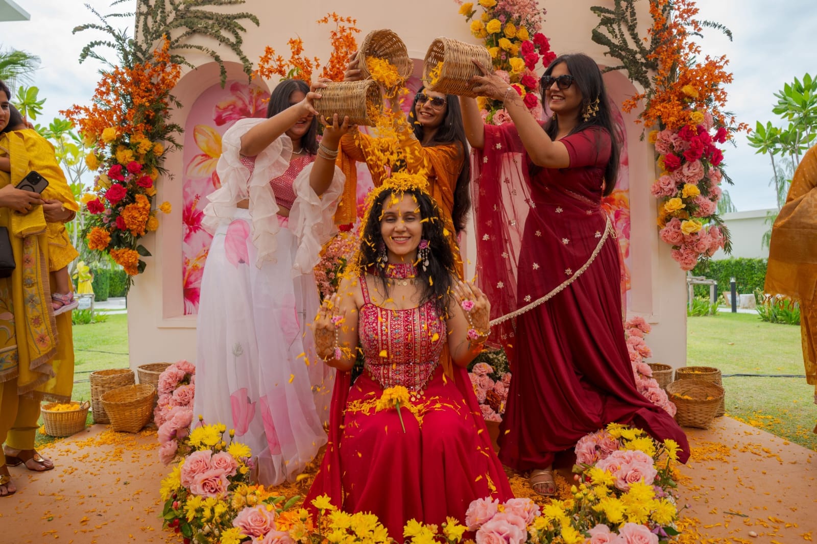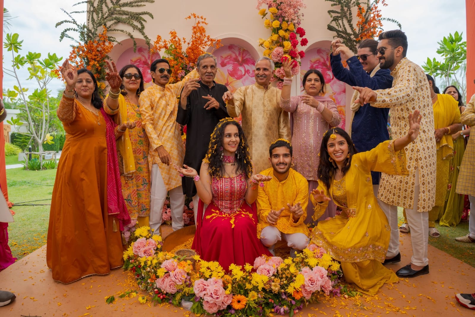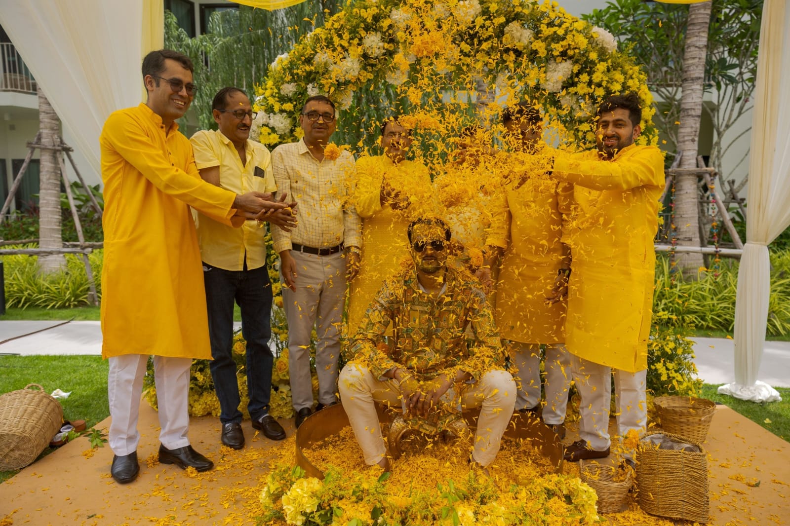 Seperate decoration set ups were put up in the Garden for the haldi of bride and groom respectively. Rohit chose the traditional and elegant yellow wheras Parul went for Fushchia with multicolor and playful elements. Dholis and fun games added to the entertainment.