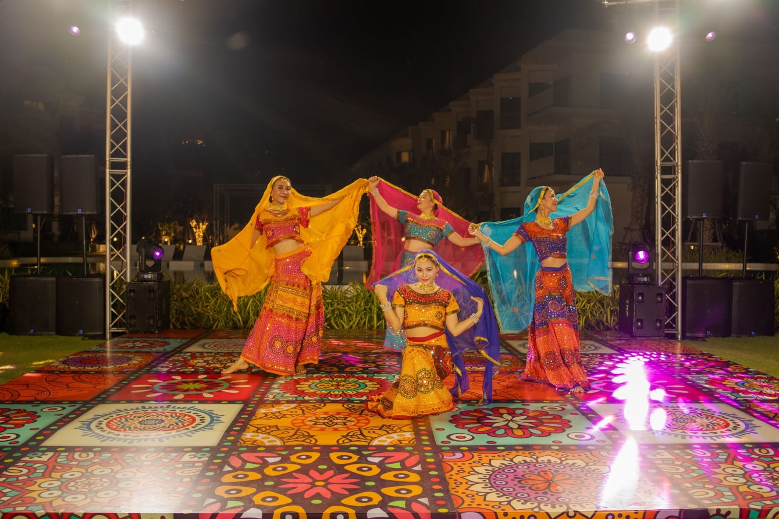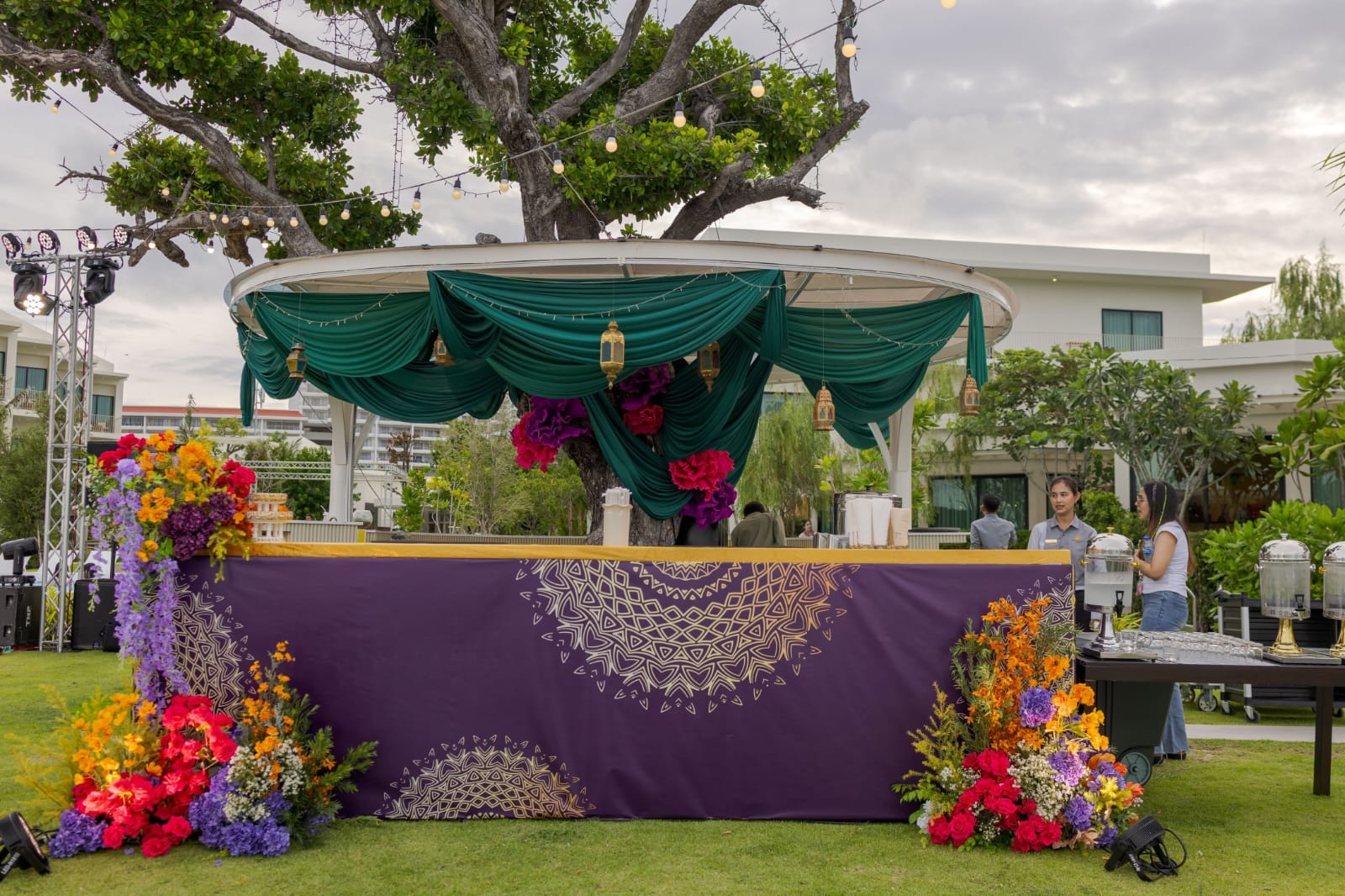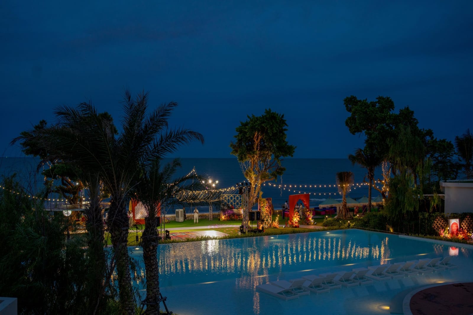 The beach lawn was chosen as the venue for the welcome event. Decor palette was multicolor, especially Rajasthani style. Parul wanted to give it a modern touch since the set up was near sea and sand hence we added morrocan theme elements to give it a fusion. Performances of Dholis, Indo-Thai dance troupe and the fireshow added the fun and spark which kickstarted the festivites with a blast!